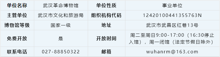 武漢革命博物館位于武昌紅巷13號(hào),下轄武昌農(nóng)講所、毛澤東舊居、中共五大會(huì)址、起義門(mén)、中國(guó)共產(chǎn)黨紀(jì)律建設(shè)歷史陳列展等五處革命舊址和紅色場(chǎng)館,是風(fēng)云1927年的重要見(jiàn)證。場(chǎng)館總占地面積32122.41平方米,建筑面積為21081.72平方米,展廳面積10395.44平方米?,F(xiàn)為國(guó)家一級(jí)博物館、全國(guó)重點(diǎn)文物保護(hù)單位、全國(guó)愛(ài)國(guó)主義教育示范基地、全國(guó)廉政教育基地、全國(guó)百個(gè)紅色旅游經(jīng)典景區(qū)、國(guó)家AAAA級(jí)旅游景區(qū)、全國(guó)文明單位、全國(guó)法治宣傳教育基地、全國(guó)關(guān)心下一代黨史國(guó)史教育基地,年接待觀眾240萬(wàn)人次以上,每年舉辦、引進(jìn)、輸出展覽10多個(gè),舉辦社教活動(dòng)50余次。博物館現(xiàn)已成為征集、收藏、保護(hù)、研究武漢地區(qū)近現(xiàn)代文物、革命文物、黨史文物和展示大革命史、中共黨史及重大歷史事件的綜合性博物館,更是大革命史和武漢地區(qū)黨史的研究中心。是武漢地區(qū)紅色景點(diǎn)最多、內(nèi)涵最豐富、資源保護(hù)最早、知名度最高的紅色旅游資源富集區(qū),現(xiàn)已成為全面從嚴(yán)治黨的圣地、紀(jì)律教育的基地和紅色旅游的勝地。
